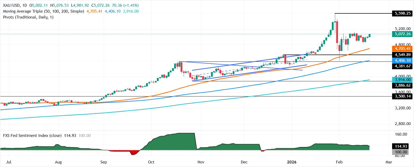 تغيرت الصورة الفنية من محايدة إلى ميالة نحو الصعود، ولكن يحتاج المشترون إلى تجاوز مستوى 5100 دولار للحصول على فرصة لدفع المعدن الأصفر لإعادة اختبار الأسعار الأعلى، وإذا تم تجاوزها، ستكون منطقة المقاومة التالية عند 5200 دولار، تليها القمة عند 5451 دولار في 30 يناير، بينما إذا ظل الذهب حول 5000-5050 دولار، فقد يبقى محصورًا في نطاق سعري بينما ينتظر المتداولون محفزات إضافية، وأي انخفاض تحت أدنى مستوى النطاق سيعرض القاع اليومي في 17 فبراير عند 4841 دولار، تليه المتوسط المتحرك البسيط لمدة 50 يومًا عند 4681 دولار.