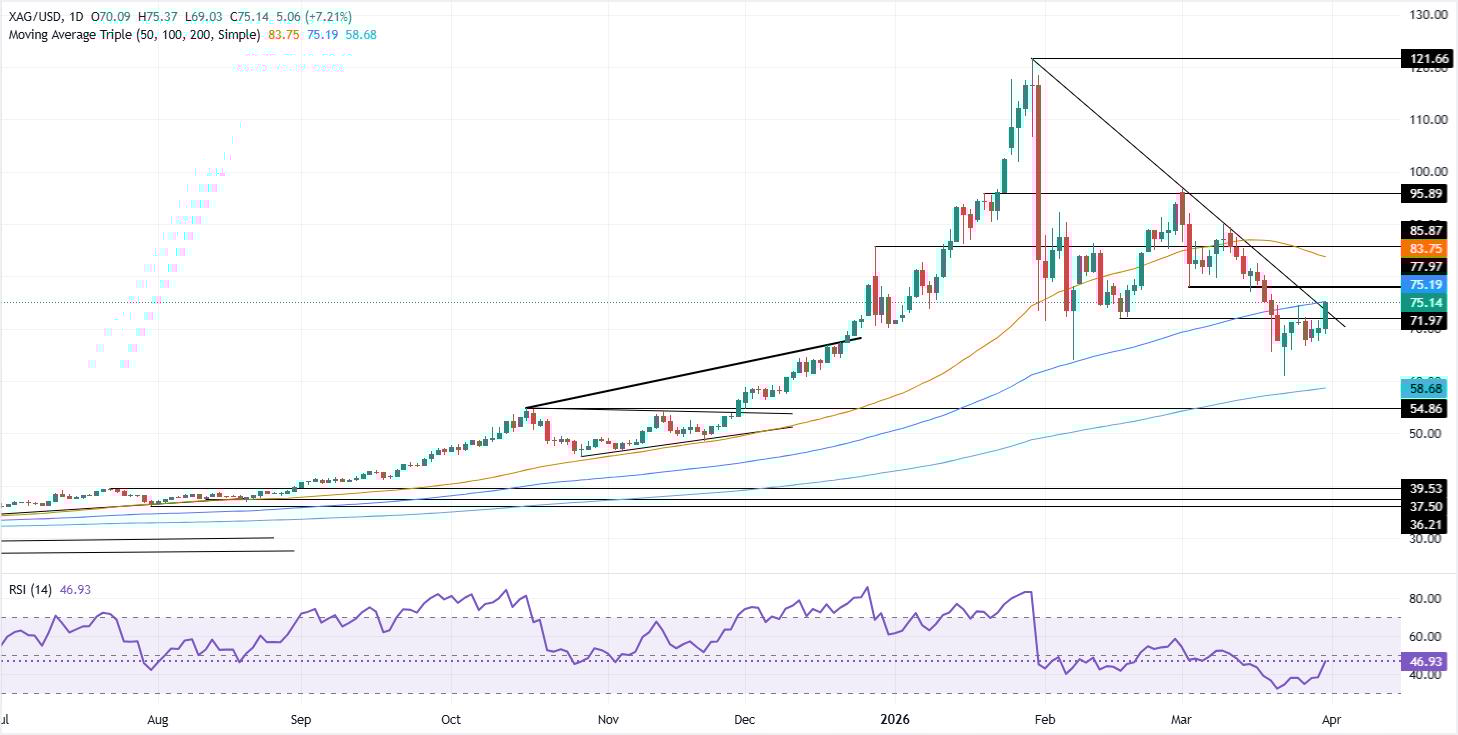 للاستمرار في الاتجاه الصعودي، يجب على زوج الفضة/الدولار XAG/USD تجاوز المتوسط المتحرك البسيط 20 يوم عند 77.32 دولار، يليه مستوى 80.00 دولار، والاختراق الواضح يفتح الباب لتحدي المتوسط المتحرك البسيط 50 يوم عند 84.03 دولار.