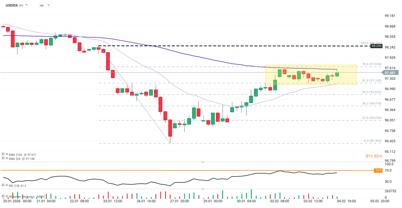 مؤشر الدولار الأمريكي يظهر تذبذباً ضمن نطاق ضيق بين مستويي تصحيح فيبوناتشي 61.8% و78.6% للحركة الهبوطية الأخيرة (97.16-97.66)، حيث يشهد تحرك السعر انضغاطاً متزايداً بين متوسطين متحركين أسيين: المتوسط المتحرك الأسي لفترة 24 (باللون البنفسجي الفاتح) والمتوسط المتحرك الأساسي لفترة 120 (باللون البنفسجي الداكن)، وقد يُمهد اختراق المتوسط المتحرك الأساسي طويل الأجل، متبوعاً بتقاطع صعودي للمتوسط المتحرك الأسي قصير الأجل، الطريق أمام المؤشر لسد الفجوة السعرية الكبيرة التي تشكلت في 23 يناير