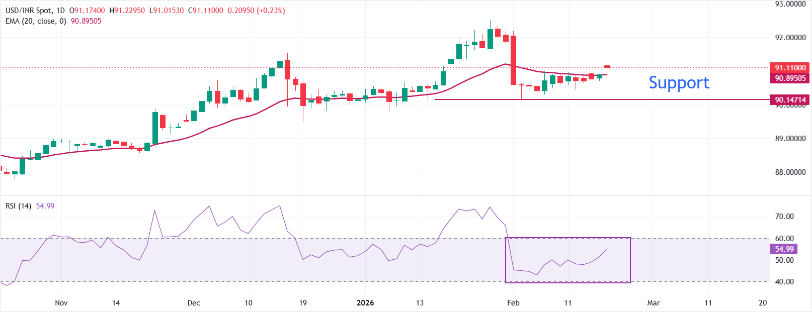 يتداول USD/INR بشكل مرتفع بشكل حاد عند حوالي 91.10 في وقت كتابة التقرير حيث يحافظ السعر على مستواه فوق المتوسط المتحرك الأسي لمدة 20 يومًا عند 90.89 مما يشير إلى أن التراجع قد تراجع وهو ما يعزز من الزخم الصعودي.