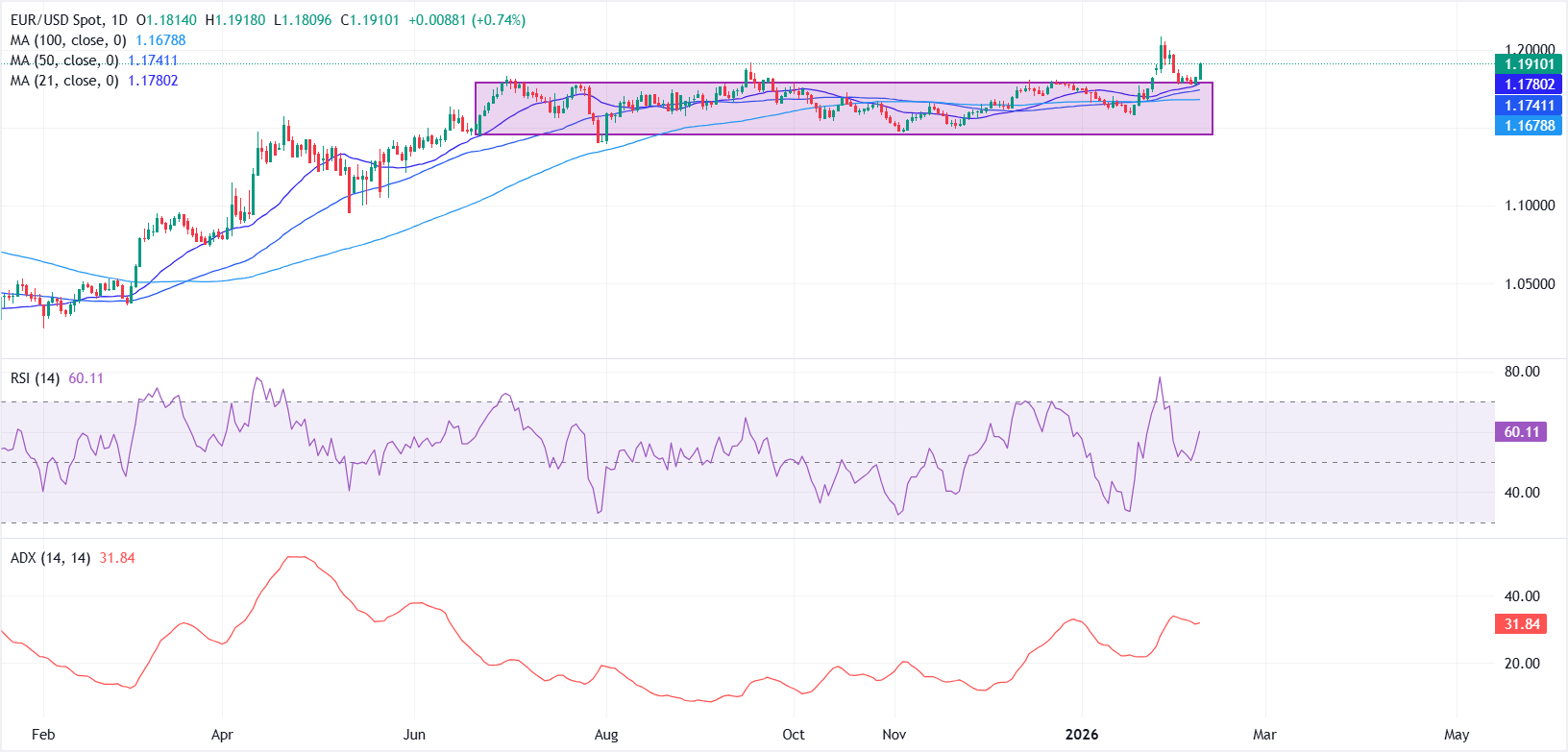 من الناحية الفنية، يظهر الرسم البياني اليومي استقرار زوج يورو/دولار EUR/USD فوق المتوسطات المتحركة الرئيسية، حيث تجاوز المتوسط المتحرك البسيط لمدة 21 يومًا المتوسطات المتحركة البسيطة لمدة 50 و100 يوم، مما يعزز الاتجاه الصعودي، بينما تستمر جميع المتوسطات في الميل نحو الأعلى، ويعمل المتوسط المتحرك البسيط لمدة 21 يومًا عند 1.1780 كأول طبقة من الدعم الديناميكي.