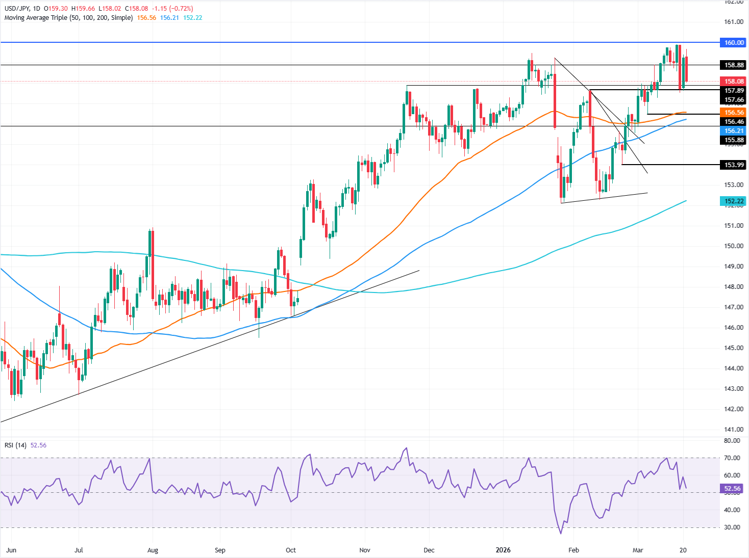 يبدو أن المشهد الفني لزوج الدولار الأمريكي/الين الياباني كان منحازًا صعوديًا يوم الجمعة، لكن الانعكاس المفاجئ يوم الاثنين قد يفتح الباب لاختبار الدعم الرئيسي عند 156.46، وهو أدنى مستوى تم تسجيله في 5 مارس، حيث لا يزال الزخم صعوديًا لكنه بدأ في التلاشي كما يشير مؤشر القوة النسبية المتراجع والذي يقترب من كسر مستوى 50 المحايد.
