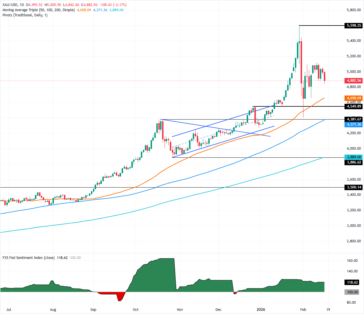 التوقعات الفنية لزوج XAU/USD: تكافح عند 5000 دولار، تنهار إلى ما دون 4900 دولار