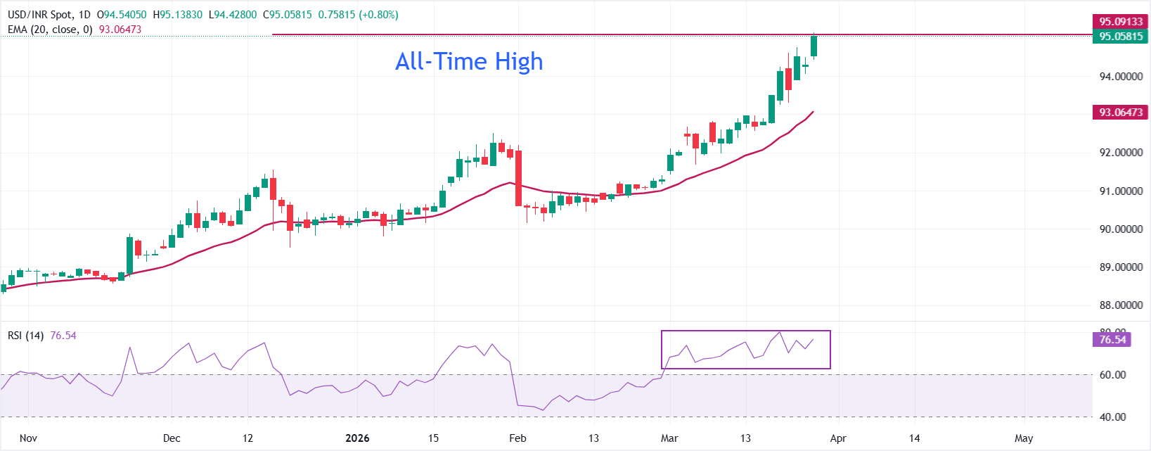 يمتد ارتفاع الدولار الأمريكي/الروبية الهندية USD/INR فوق 95.00 يوم الجمعة، حيث الميل على المدى القريب صعودي، مع استمرار السعر في الضغط صعودًا فوق المتوسط المتحرك الأسي (EMA) لمدة 20 يومًا، مما يدعم التقدم، تسلسل الإغلاقات الأعلى منذ منتصف الشهر يحافظ على الضغط الصعودي، بينما مؤشر القوة النسبية RSI عند 76.54 يبقى في منطقة التشبع الشرائي، مما يشير إلى زخم قوي، رغم أنه يحذر من أن الارتفاع قد يواجه خطر التوقف إذا نفد الشراء.