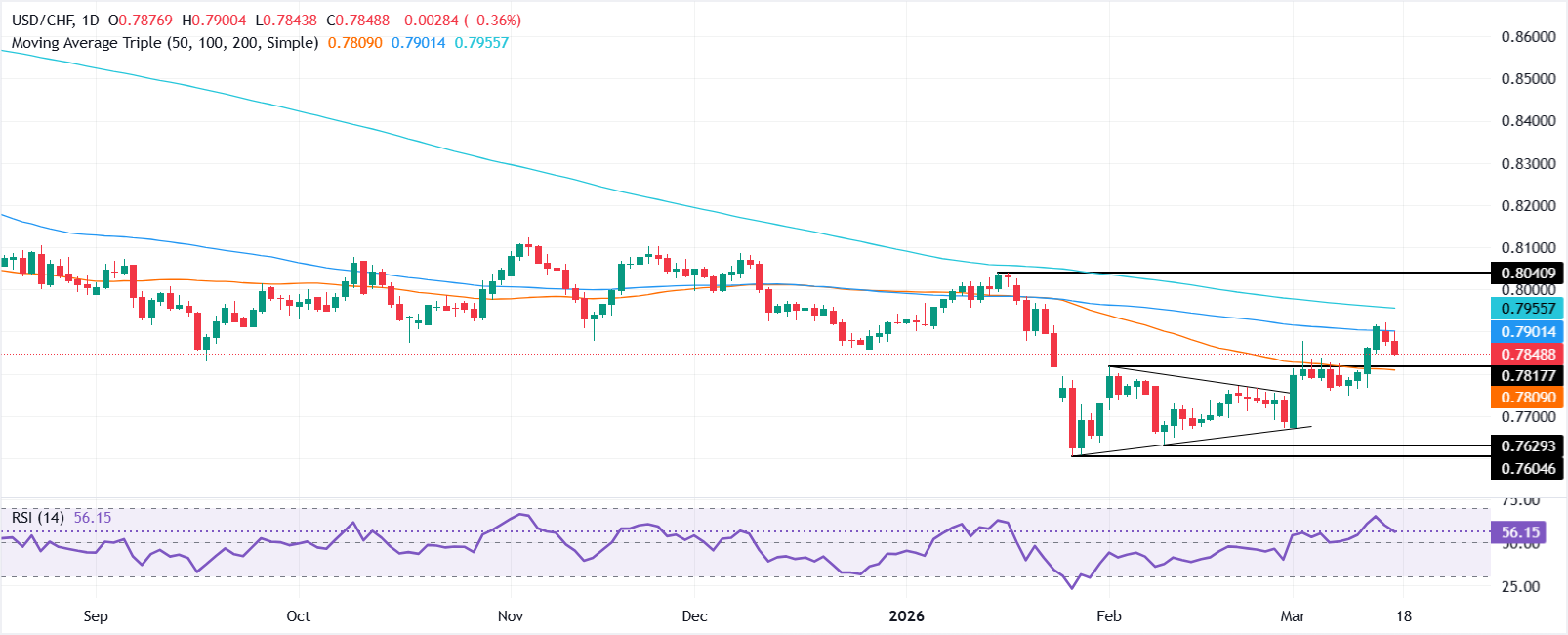 انخفض زوج الدولار الأمريكي/الفرنك السويسري USD/CHF بنسبة 0.20% ليصل إلى 0.7850، وذلك بعد مقاومة عند المتوسط المتحرك البسيط لمدة 100 يوم الذي سجل 0.7897، مما يثير قلق المتداولين قبل قرار السياسة النقدية لمجلس الاحتياطي الفيدرالي المرتقب يوم الأربعاء، حيث يتوقع المستثمرون تأثيرات واضحة على الأسواق وحركة الأموال.