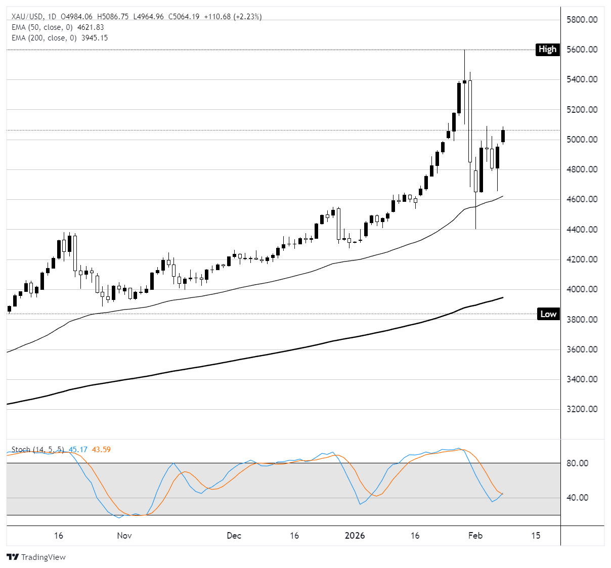 يظهر مؤشر التذبذب ستوكاستيك (14، 5، 5) على الرسم البياني اليومي قراءة عند 45.09/43.57، مما يشير إلى وضع محايد بالقرب من الخط الأوسط بعد ارتداده بشكل حاد من منطقة التشبع البيعي خلال عمليات البيع الأسبوع الماضي، وهو ما يمنح المؤشر مجالًا للتحول للأعلى دون الوصول إلى ظروف تشبع شرائي كما حدث قبل القمة العالية في 29 يناير، وقد شكلت الحركة السعرية يوم الاثنين جسم شمعة صعودية قوية مع شمعات صغيرة على كلا الجانبين، مما يدل على قناعة حقيقية في الشراء بدلاً من تغطية مراكز البيع، وتوجد المقاومة الفورية عند 5100 دولار، تليها منطقة 5200 دولار حيث قيد البائعون الارتفاعات في أواخر يناير قبل الارتفاع النهائي إلى أعلى مستوى على الإطلاق، وسيفتح التحرك المستدام فوق 5200 دولار الطريق نحو 5400 دولار، وهي منطقة القمة السابقة، بينما الرقم الدائري 5000 دولار يعمل الآن كأول دعم، مع توقع طلب أقوى في منطقة 4800 دولار حيث تم دمج السعر لفترة وجيزة خلال التصحيح الأخير.