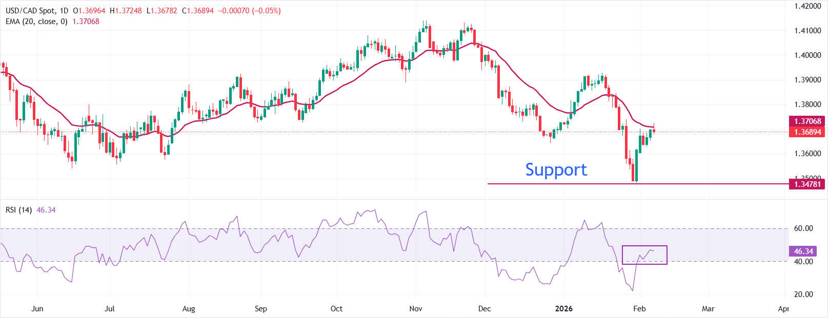 يتداول زوج الدولار الأمريكي/الدولار الكندي USD/CAD بانخفاض عند حوالي 1.3690 في وقت كتابة هذا التقرير حيث يجلس الزوج تحت المتوسط المتحرك الأسي لمدة 20 يومًا عند 1.3707 ويميل المتوسط إلى الانخفاض مما يعزز تحيزًا هبوطيًا طفيفًا كما أن حركة الأسعار محصورة تحت هذا الحاجز الديناميكي مما يحافظ على احتواء الارتدادات.