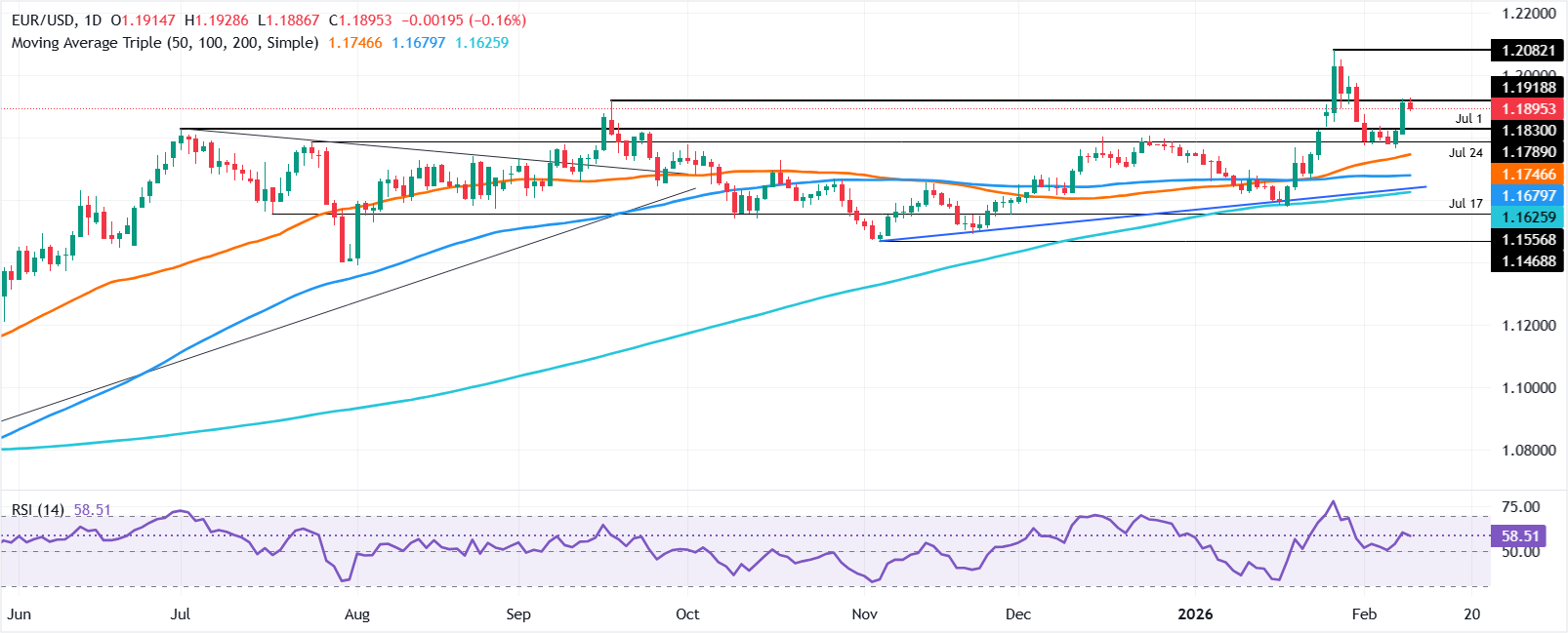 لتحقيق نتيجة صعودية، يراقب المتداولون اختراقًا حاسمًا فوق 1.1900 وبمجرد تجاوزه، ستكون المحطة التالية هي أعلى مستوى في 30 يناير عند 1.1974 تليها قمة 29 يناير عند 1.1996 قبل 1.2000.