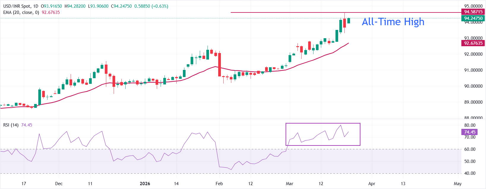 التحليل الفني: USD/INR يهدف إلى إعادة اختبار أعلى مستوى له على الإطلاق عند 94.60