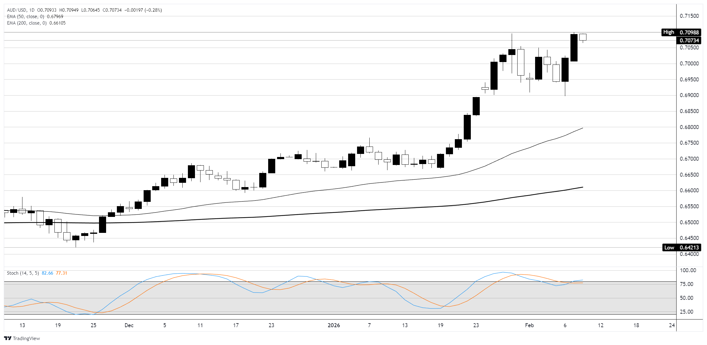 يشهد الدولار الأسترالي ارتفاعًا ملحوظًا على الرسم البياني اليومي حيث يتجاوز السعر المتوسط المتحرك الأسي (EMA) لمدة 50 يومًا عند 0.6797 والمتوسط المتحرك الأسي (EMA) لمدة 200 يومًا عند 0.6611 مما يعكس هيكلًا صعوديًا واضحًا منذ أدنى مستوى في أواخر نوفمبر قرب 0.6421 وقد دفع زوج AUD/USD خلال جلسة يوم الاثنين إلى مستويات جديدة لم يشهدها منذ ثلاث سنوات عند 0.7099 حيث اختبر المستوى النفسي 0.7100 قبل أن يتراجع ليغلق حول 0.7072 وكان الارتفاع من قاعدة ديسمبر بالقرب من 0.6500 قويًا وغير متقطع إلى حد كبير حيث تجاوز الزوج مستوى 0.7000 لأول مرة منذ فبراير 2023 ويستمر الفارق بين السعر والمتوسط المتحرك الأسي (EMA) لمدة 50 يومًا في الاتساع مما يدل على أن الحركة أصبحت مفرطة بينما تعزز الزيادة الأخيرة بمقدار 25 نقطة أساس من بنك الاحتياطي الأسترالي (RBA) إلى 3.85% والمسار المتساهل للاحتياطي الفيدرالي (Fed) مناخًا إيجابيًا عبر تباين السياسات.