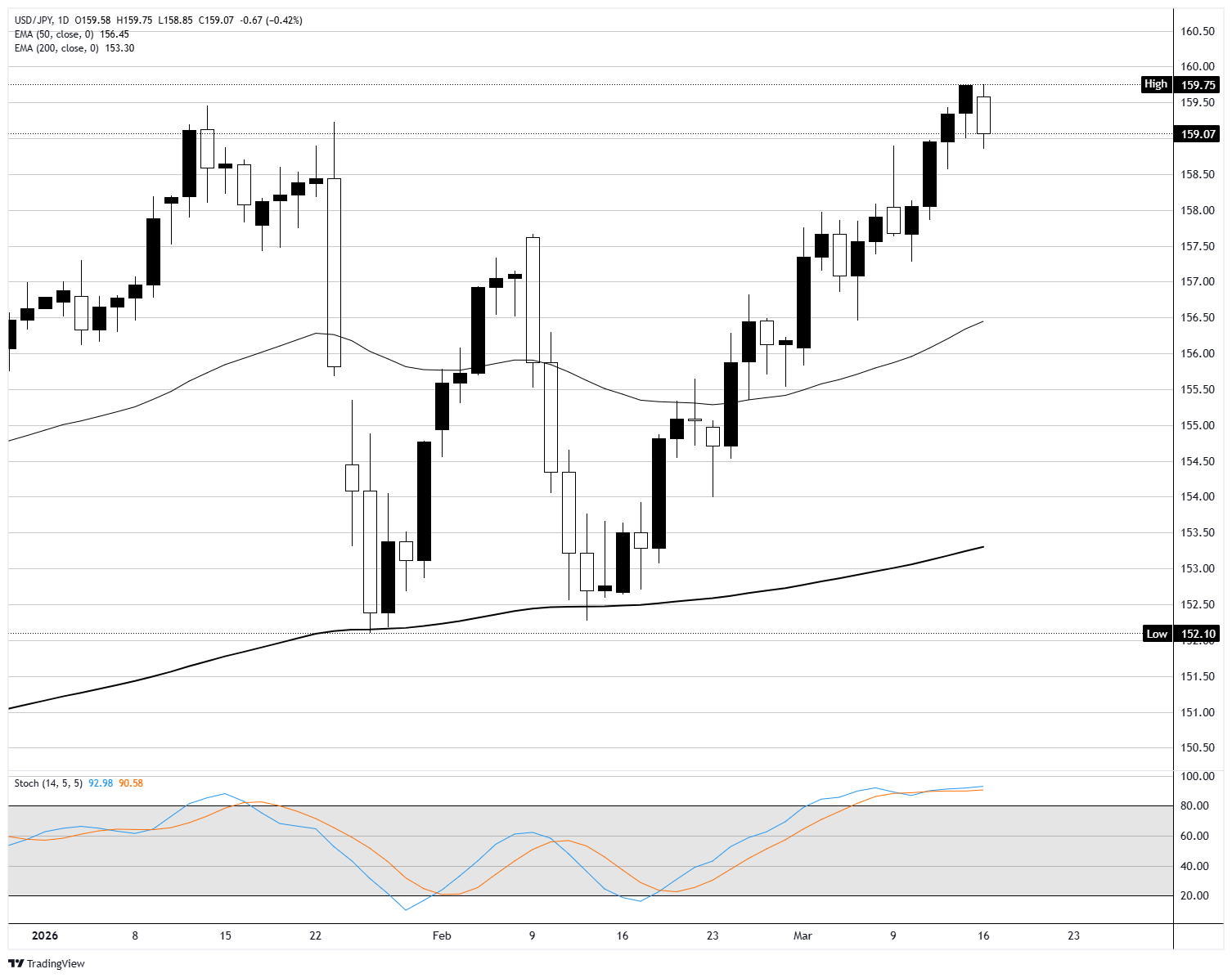 شهد زوج دولار/ين USD/JPY تراجعًا بنسبة %0.4 يوم الاثنين، منهياً سلسلة انتصارات استمرت لأربع جلسات وساحباً إلى منطقة 159.00 في حركة سوق غير ملحوظة وارتفع الزوج من أدنى مستوياته في فبراير بالقرب من 152.10، لكن الشمعة الهبوطية المتواضعة يوم الاثنين بالقرب من أعلى نطاق حديث تشير إلى أن أعلى مستوى خلال اليوم عند 159.75 لم يجذب عمليات شراء مستمرة، لا يزال النمط الأوسع من الارتفاعات الأدنى منذ فبراير ساريًا، على الرغم من أن الزوج يبدو ممتدًا بشكل ملحوظ بالنسبة لمتوسطاته المتحركة الرئيسية.