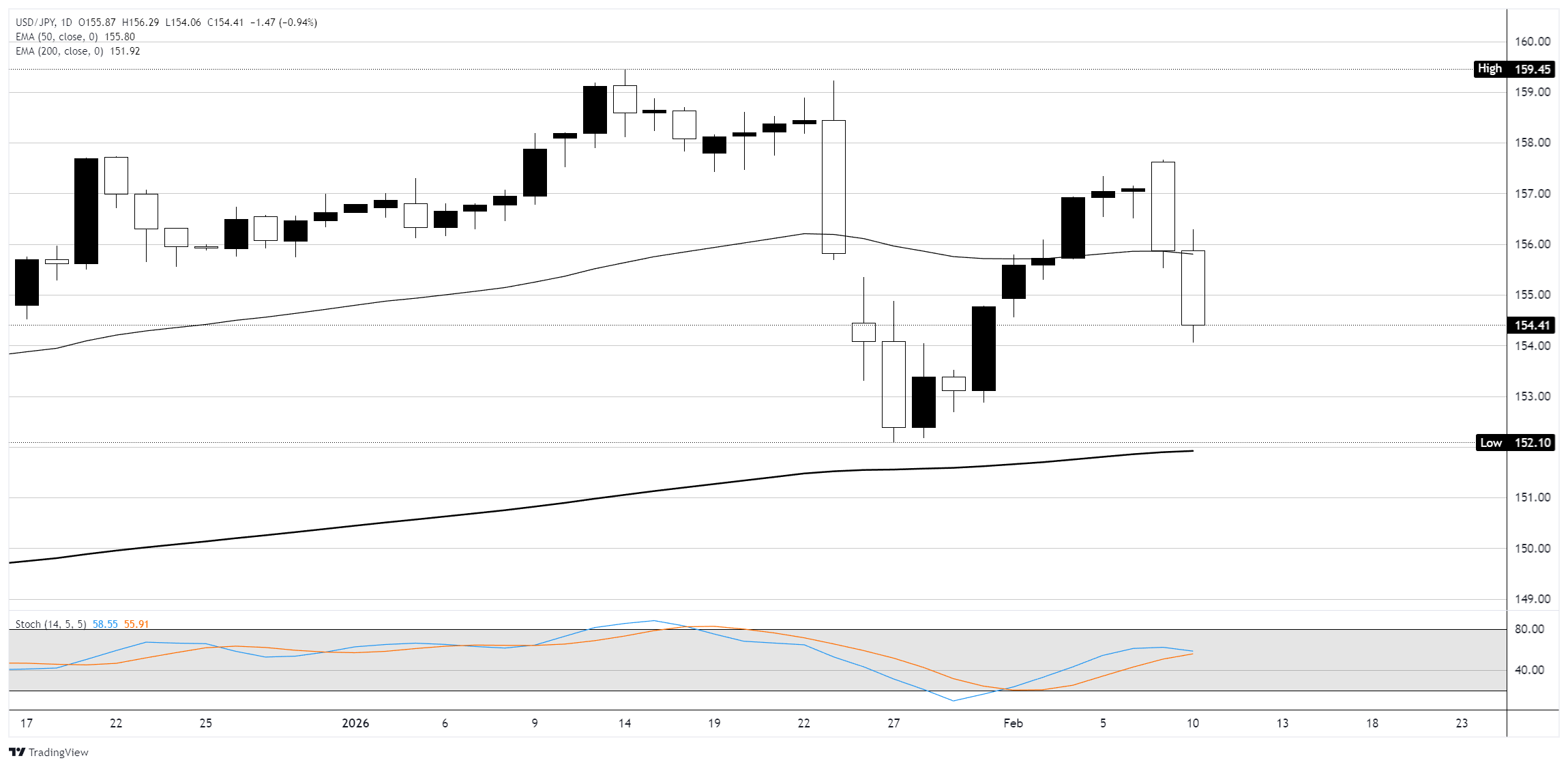 يتداول زوج دولار/ين USD/JPY في هيكل متقلب ومحدود النطاق على الرسم البياني اليومي، متأرجحًا بين أعلى مستوى في يناير بالقرب من 159.450 وأدنى مستوى في أواخر يناير عند 152.100، أغلق السعر يوم الاثنين عند 154.410، متراجعًا بشكل حاد بمقدار 1.47 ين (0.94%) بعد فجوة أولية صعودية عقب فوز رئيس الوزراء تاكايشي الساحق في الانتخابات، والذي قوبل بتدخل لفظي من وزير المالية كاتاياما وأعلى مسؤول عملة في اليابان ميمورا، حيث أشار كلاهما إلى الاستعداد للتصرف بشأن تقلبات الين، مما يزيد من حدة التوترات في الأسواق.