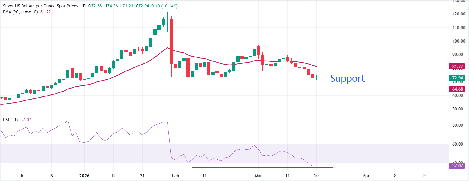 يتداول زوج الفضة/الدولار XAG/USD بشكل مستقر عند حوالي 72.80 دولار وقت النشر، حيث يظل التحيز القريب الأجل هبوطيًا، حيث يستمر السعر في الانخفاض دون المتوسط المتحرك الأسي (EMA) لمدة 20 يومًا، والذي يتتبع الآن فوق السعر الفوري ويعمل كمقاومة ديناميكية قرب 81.22 دولار، بينما يؤكد تسلسل الإغلاقات الأدنى من منتصف التسعينات إلى أدنى مستويات السبعينات استمرار ضغط البيع، كما أن مؤشر القوة النسبية RSI الذي انخفض دون 40.00 لأول مرة منذ 11 شهرًا يؤكد الزخم الهبوطي دون الوصول إلى منطقة التشبع البيعي، مما يبقي البائعين في السيطرة ما لم يتمكن السعر من التعافي والاستقرار فوق المتوسط المكسور.