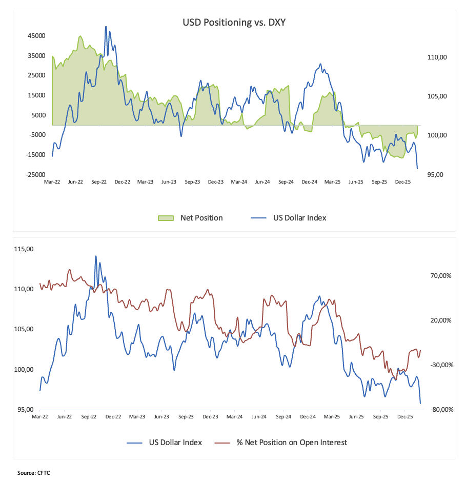 وفقًا للجنة تداول السلع الآجلة، قام المتداولون غير التجاريين بتصفية مراكزهم القصيرة الصافية في الدولار الأمريكي إلى أدنى مستوياتها في أسبوعين عند حوالي 4.4 ألف عقد، بالإضافة إلى ذلك، ارتفعت الفائدة المفتوحة إلى ما يقرب من 31.8 ألف عقد، مما عكس انخفاضين أسبوعين متتاليين.