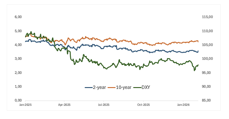ترك الاحتياطي الفيدرالي أسعار الفائدة دون تغيير في اجتماعه في يناير/كانون الثاني، حيث حافظ على النطاق المستهدف لأسعار الفائدة عند 3.50%-3.75% بما يتماشى مع التوقعات، وكانت نبرة البيان أكثر تفاؤلاً بشكل طفيف، حيث أشار صانعو السياسة إلى نمو قوي وتخلوا عن الإشارات السابقة بشأن المخاطر السلبية المتزايدة على التوظيف.