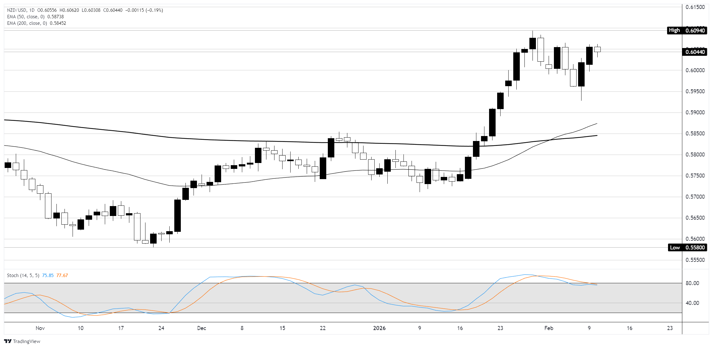 شهد الزوج تشكيل سلسلة من القيعان المرتفعة منذ أوائل ديسمبر، حيث عبر المتوسط المتحرك الأسي (EMA) لمدة 50 يومًا فوق المتوسط المتحرك الأسي (EMA) لمدة 200 يوم لتأكيد هيكل الاتجاه الصعودي، وقد أبقى تقرير التوظيف النيوزيلندي المختلط الأسبوع الماضي، الذي أظهر ارتفاع معدل البطالة إلى أعلى مستوى له في عقد عند %5.4 بينما تجاوز نمو التوظيف التوقعات عند %0.5، الجدول الزمني لرفع أسعار الفائدة من قبل بنك الاحتياطي النيوزيلندي (RBNZ) غير مؤكد، حيث تقوم الأسواق الآن بتسعير أول تحرك في موعد لا يتجاوز أكتوبر، ويجتمع بنك الاحتياطي النيوزيلندي يوم الأربعاء المقبل، 18 فبراير، لإصدار أول بيان للسياسة النقدية تحت إدارة الحاكم الجديد آنا بريمان، مع توقعات واسعة بأن يبقى سعر الفائدة الرسمي (OCR) ثابتًا عند %2.25.