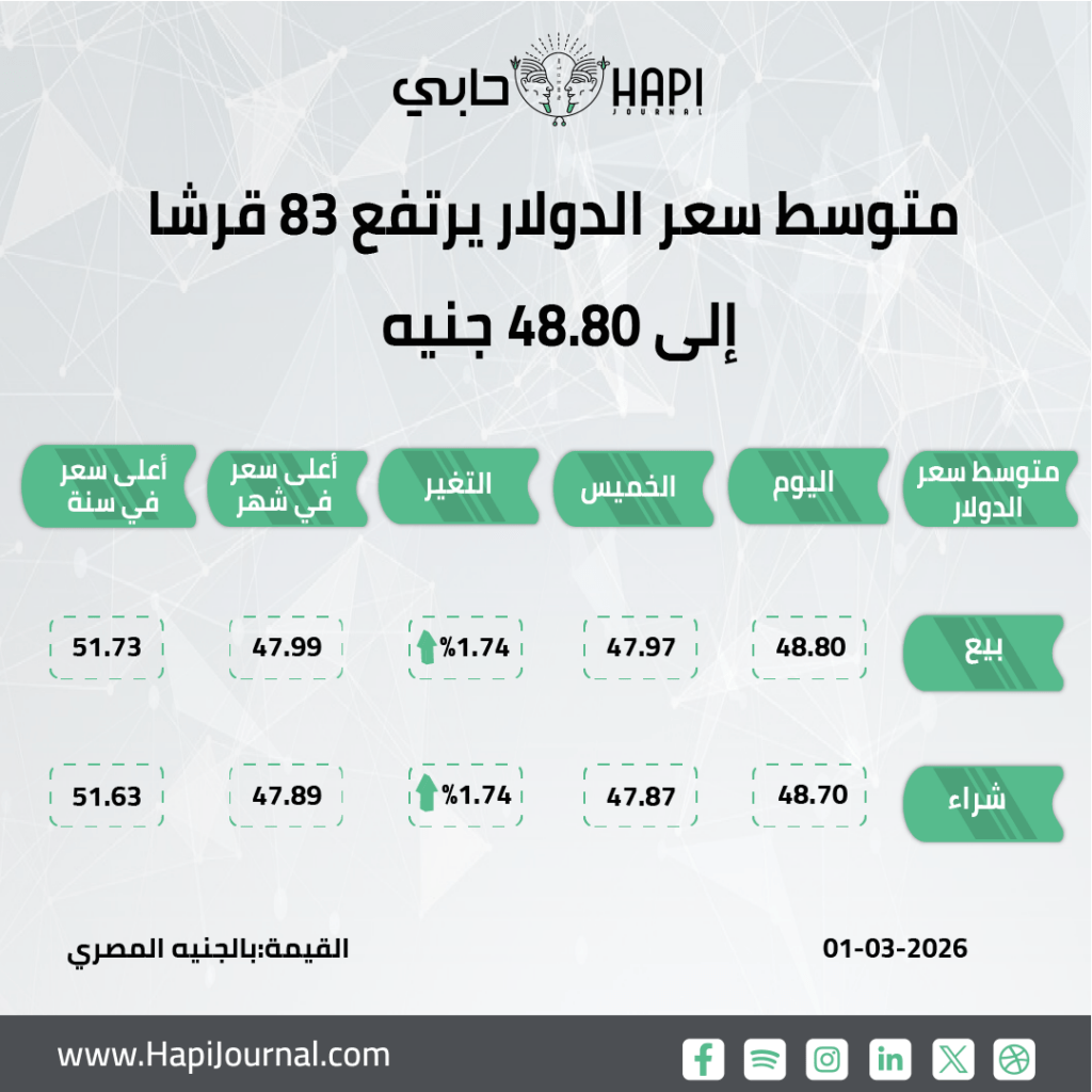 ويعتبر هذا الارتفاع هو الأعلى للدولار منذ 28 يوليو 2025 عندما سجل متوسط سعر 48.72 جنيه للشراء و48.82 جنيه للبيع.