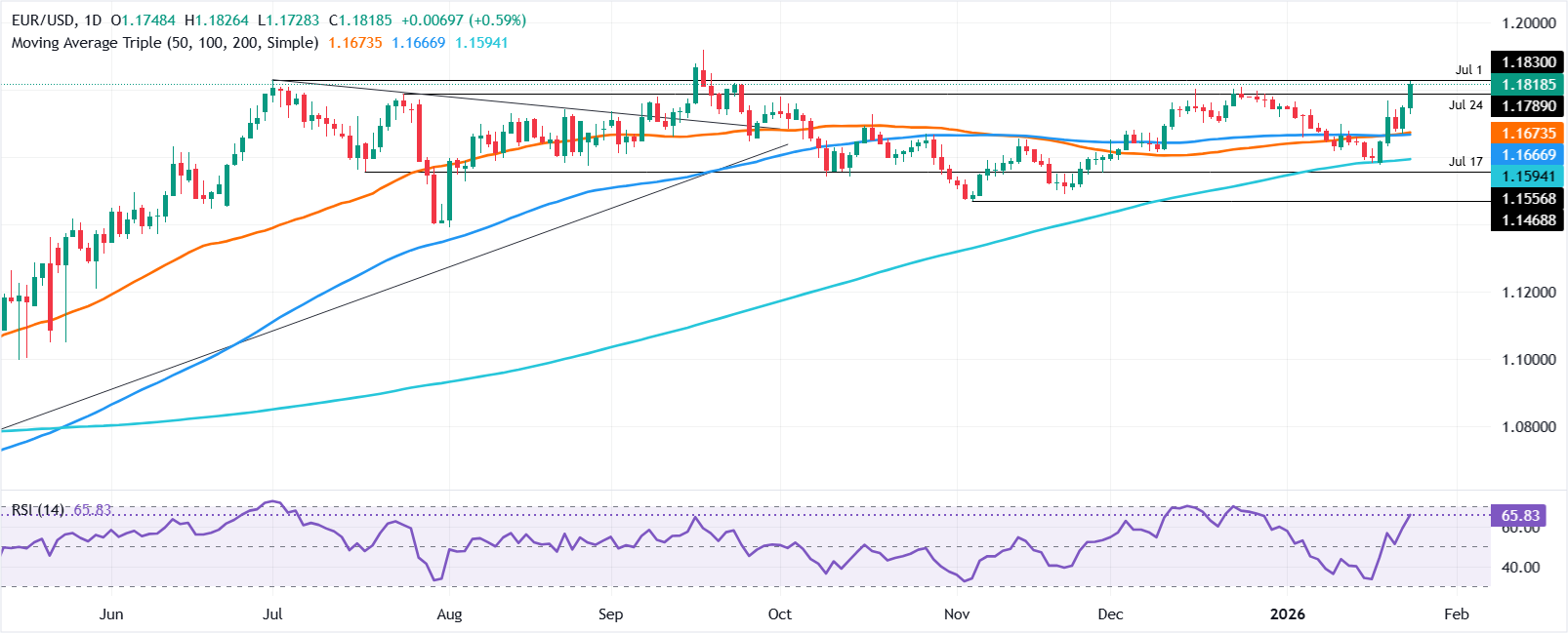 تظهر الصورة الفنية لزوج يورو/دولار EUR/USD اختراقًا لخط الاتجاه الهبوطي المرسوم من أعلى مستويات سبتمبر وديسمبر، والذي تم تخطيه عند حوالي 1.1775، مما دفع الزوج لتجاوز مستوى 1.1800 ليصل إلى أعلى مستوى سنوي عند 1.1826.