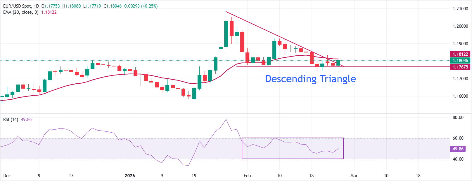 يرتفع زوج يورو/دولار إلى ما يقرب من 1.1805 في وقت كتابة هذا التقرير حيث يتذبذب مؤشر القوة النسبية (RSI) لمدة 14 يومًا داخل نطاق 40.00-60.00 مما يعكس ظروفًا متوازنة حيث تتأرجح الأسعار بالقرب من المتوسط المتحرك الأسي لمدة 20 يومًا عند 1.1800 مما يشير إلى اتجاه جانبي.
