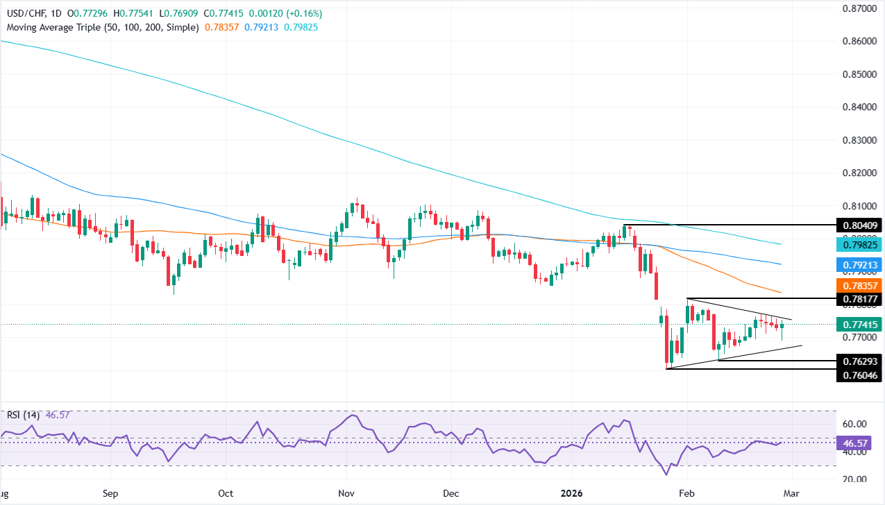 تظهر الصورة الفنية لزوج دولار أمريكي/فرنك سويسري USD/CHF بعض التماسك ضمن مثلث متماثل في اتجاه هبوطي، ومع ذلك يبدو أن حركة السعر تقترب من خط الاتجاه المقاوم لهذا النمط، وإذا تم اختراقه، سيفتح الطريق لمزيد من الارتفاع، بينما الزخم الحالي يميل نحو الاتجاه الهبوطي كما يظهر في مؤشر القوة النسبية (RSI) الذي يقع دون المستوى المحايد.