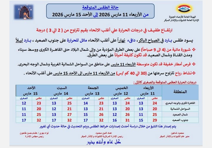 من المتوقع أن يسود طقس دافئ نهارًا في القاهرة الكبرى والوجه البحري والسواحل الشمالية الغربية وشمال الصعيد، بينما يكون مائلًا للدفء في جنوب الصعيد.