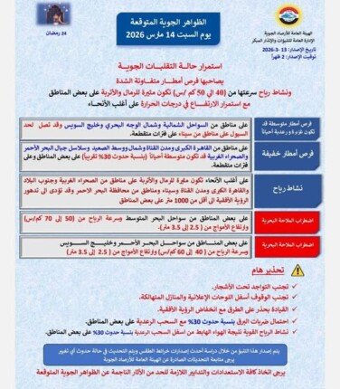 أعلنت هيئة الأرصاد الجوية عن حالة الطقس المتوقعة اليوم حيث تشهد البلاد تقلبات جوية تشمل سقوط أمطار متفاوتة الشدة مع نشاط للرياح التي قد تثير الرمال والأتربة في بعض المناطق مما يؤثر على مستوى الرؤية الأفقية في الطرق بينما تستمر درجات الحرارة في الارتفاع على معظم الأنحاء.