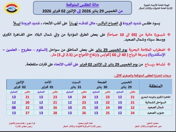 كشفت الهيئة العامة للأرصاد الجوية عن تفاصيل درجات الحرارة العظمى والصغرى المتوقعة خلال الفترة من الخميس إلى الاثنين وجاءت على النحو التالي: