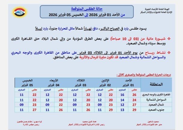 تستعرض الهيئة العامة للأرصاد الجوية حالة الطقس خلال الأيام المقبلة من 1 فبراير حتى 5 فبراير 2026، ضمن خدمة مستمرة تقدمها للمتابعين.
