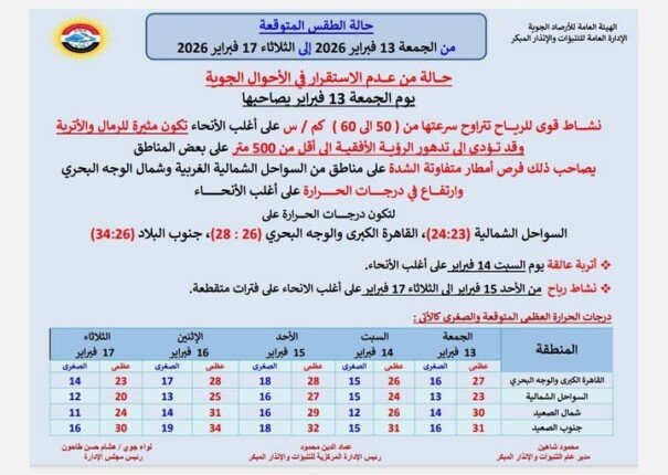 كما أوضحت الهيئة العامة أن طقس الأيام المقبلة ابتداءً من يوم الجمعة 13 فبراير إلى الثلاثاء 17 فبراير 2026 سيشهد حالة من عدم الاستقرار في الأحوال الجوية.