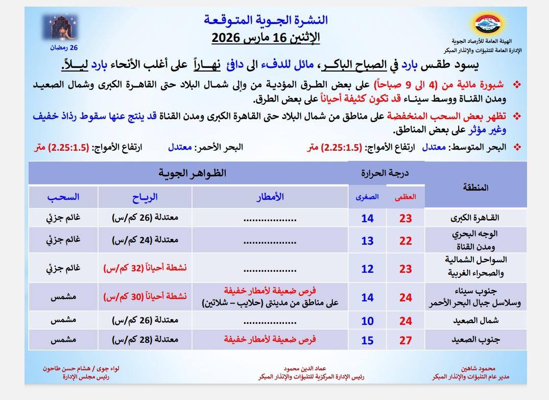 فيما يتعلق بتوقعات الطقس خلال الفترة من الاثنين 16 مارس 2026 وحتى الجمعة 20 مارس 2026، توضح الهيئة أن الطقس سيكون بارداً في الصباح الباكر، بينما يميل للدفء إلى الدفء المعتدل خلال ساعات النهار على أغلب الأنحاء، على أن يعود بارداً خلال ساعات الليل.