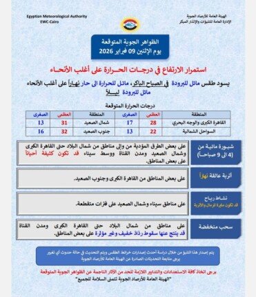 تشير توقعات الهيئة العامة للأرصاد الجوية إلى استمرار الموجة الدافئة اليوم الإثنين، حيث يسود طقس مائل للبرودة خلال ساعات الصباح الباكر، ثم يتحول إلى مائل للحرارة أو حار نهاراً في معظم المناطق، بينما تميل الأجواء للاعتدال والبرودة ليلاً مما يؤثر على الأنشطة اليومية والحركة العامة.
