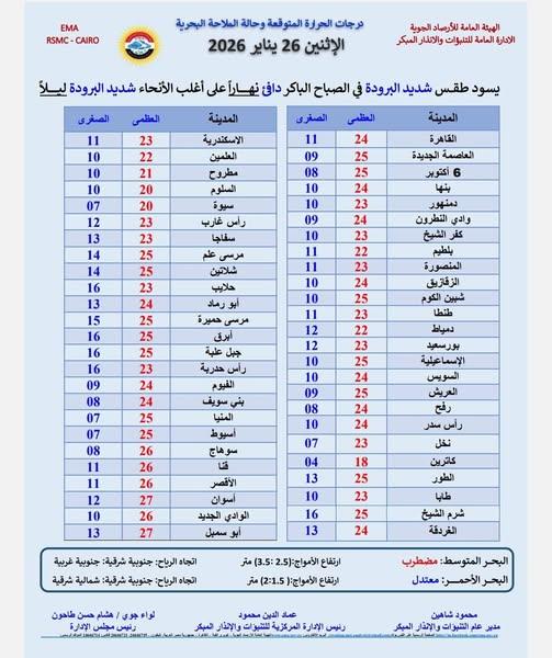 تتوقع الهيئة العامة للأرصاد الجوية أن يشهد اليوم الإثنين 26 يناير 2026 طقسًا شديد البرودة في الصباح الباكر يليه جو دافئ نهارًا على معظم أنحاء البلاد مع عودة الطقس شديد البرودة ليلاً مما يؤثر على الأنشطة اليومية والحركة العامة.