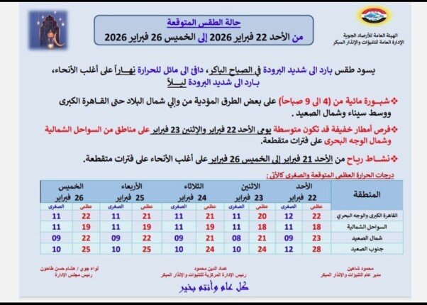 تشير التوقعات الجوية إلى أن الفترة من الأحد 22 فبراير 2026 حتى الخميس 26 فبراير 2026 ستشهد أجواءً باردة إلى شديدة البرودة في ساعات الصباح الباكر، بينما ستتحول الأجواء إلى الدفء النسبي خلال النهار في معظم المناطق، لتعود الأجواء باردة إلى شديدة البرودة ليلاً مما يؤثر على الأنشطة اليومية والحركة العامة.
