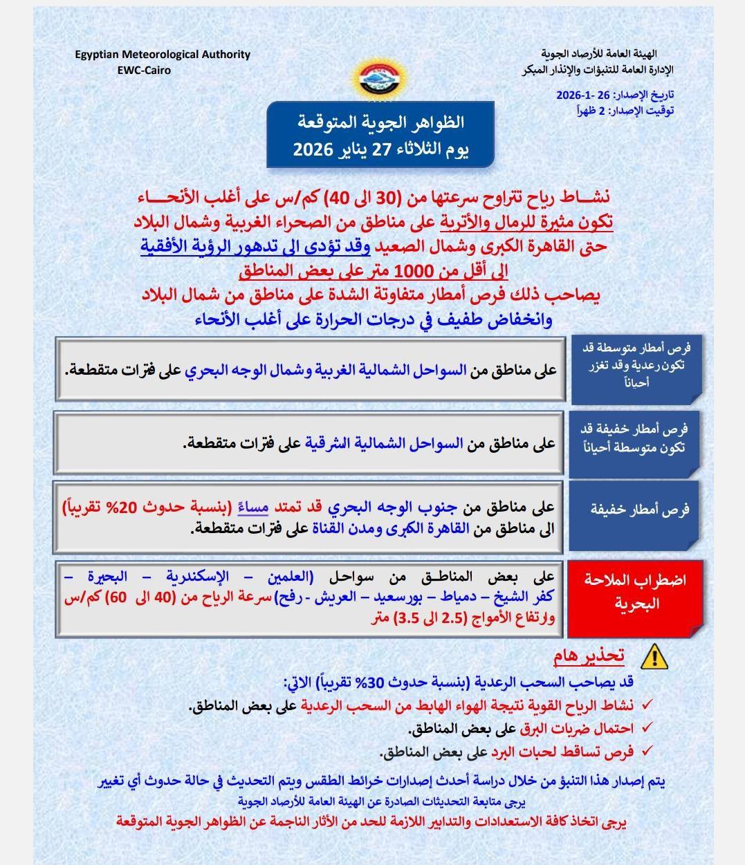 تشير التوقعات إلى نشاط الرياح في مناطق من أقصى غرب البلاد وشمالها مما يؤدي إلى إثارة الرمال والأتربة في الصحراء الغربية وشمال البلاد وتمتد هذه الظاهرة لتشمل القاهرة الكبرى وشمال الصعيد مما قد يؤثر على الرؤية الأفقية في بعض المناطق.