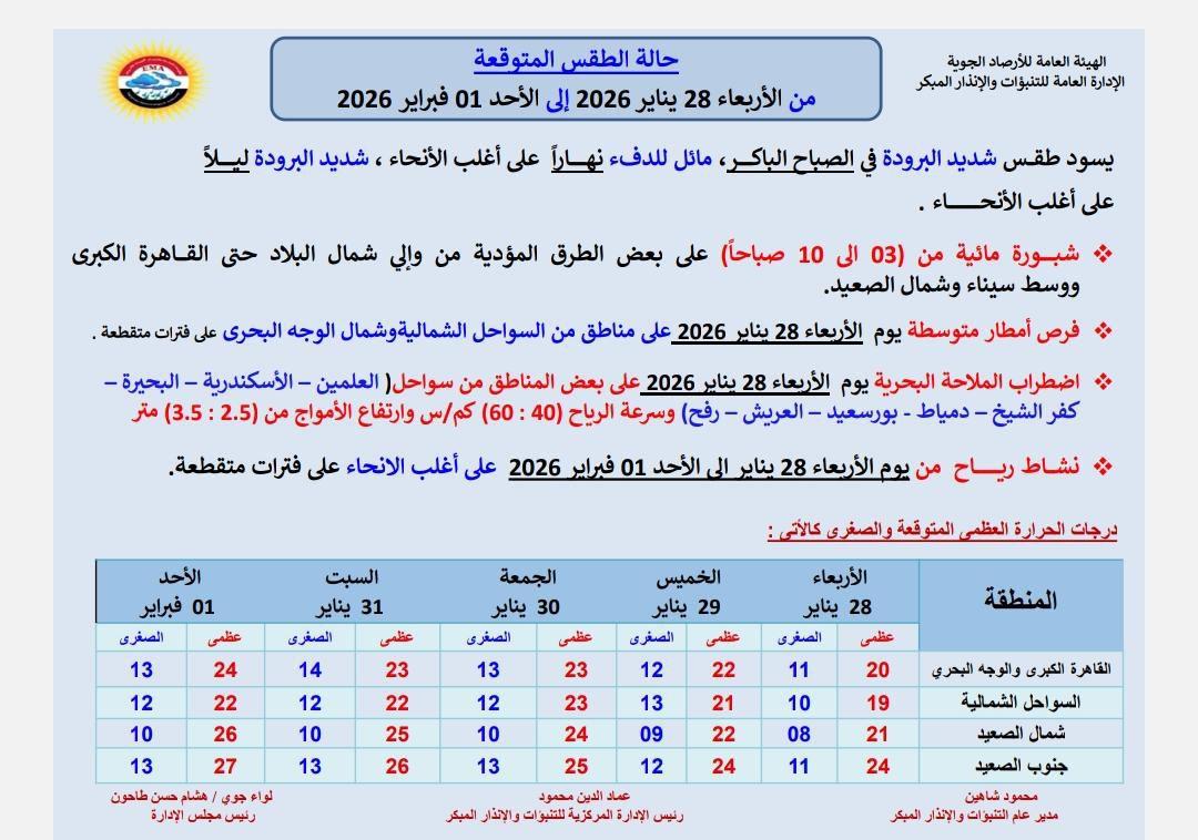 تتوقع الهيئة العامة للأرصاد الجوية حالة من الطقس المتقلب خلال الفترة من يوم الأربعاء 28 يناير 2026 حتى الأحد 01 فبراير 2026 حيث يسود طقس شديد البرودة في الصباح الباكر ويكون مائلًا للدفء خلال النهار مع استمرار البرودة ليلاً على أغلب الأنحاء مما يؤثر على الأنشطة اليومية والحركة العامة.