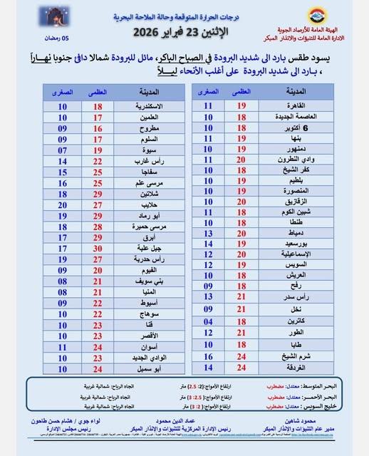 وذكرت الهيئة أنه من المتوقع أن تسجل درجات الحرارة انخفاضاً ملموساً لتتراوح في القاهرة الكبرى والوجه البحري بين 19 و20 درجة بينما تنخفض في السواحل الشمالية لتصل إلى 16-17 درجة مئوية.