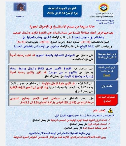 تشير التوقعات الجوية إلى أن اليوم الإثنين 23 فبراير 2026 سيشهد حالة من عدم الاستقرار الجوي تؤثر على معظم أنحاء البلاد حيث من المتوقع أن تنخفض درجات الحرارة بشكل ملحوظ مع فرص لسقوط أمطار متفاوتة الشدة في العديد من المناطق مما قد يؤثر على الأنشطة اليومية والحركة العامة.