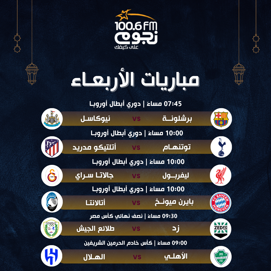 يستعد عشاق كرة القدم اليوم الأربعاء 18 مارس 2026 لمتابعة مجموعة من المباريات المثيرة التي تتضمن مواجهات بارزة في دوري أبطال أوروبا بالإضافة إلى نصف نهائي بطولة كأس مصر وكأس خادم الحرمين الشريفين حيث ينتظر الجمهور أداءً مميزًا من الفرق المشاركة.
