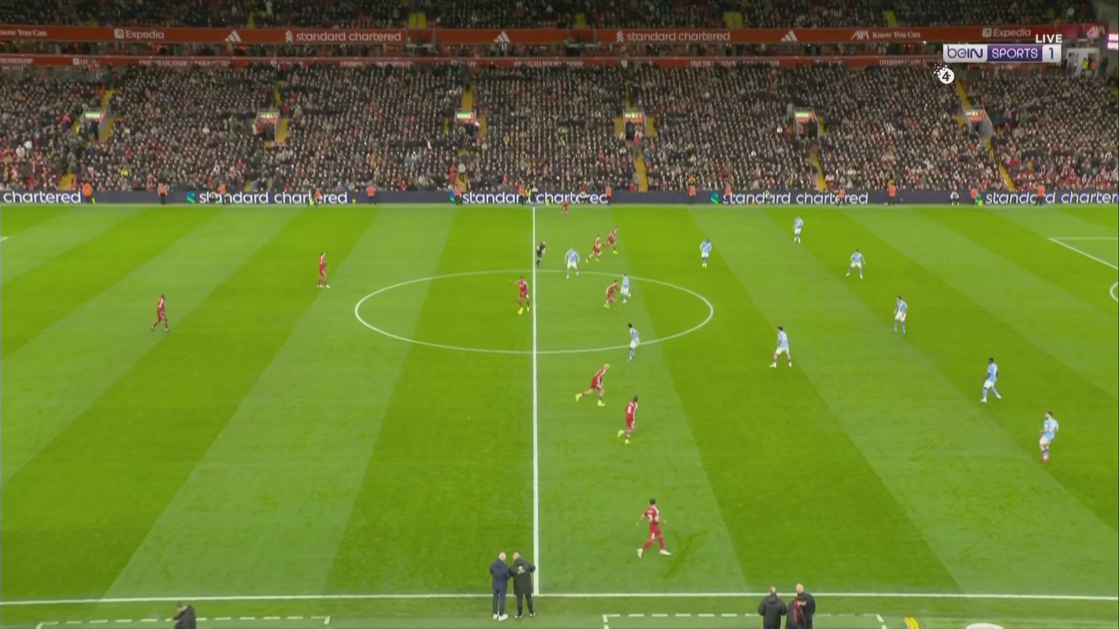 على الجانب الآخر، يسعى مانشستر سيتي للسيطرة المعتادة من خلال الاستحواذ والضغط العالي، مع التركيز على التحركات السريعة في العمق، إلا أن التنظيم الدفاعي الجيد لليفربول خلال الشوط الأول أجبر السيتي على البحث عن حلول جديدة مع بداية النصف الثاني من المباراة.