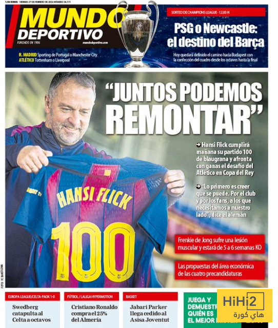 ظهر مدرب برشلونة هانسي فليك على غلاف صحيفة موندو ديبورتيفو الإسبانية حيث تم تسليط الضوء على استعداداته لمباراته المرتقبة ضد أتلتيكو مدريد في كأس الملك الإسباني.