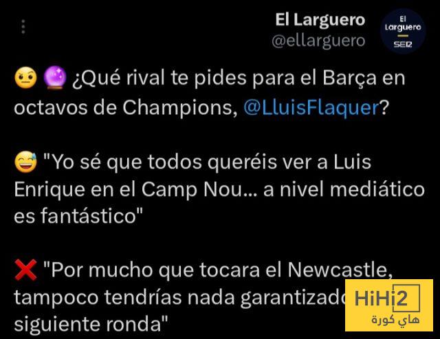 في حديثه عبر راديو كادينا سير، طرح الصحفي لويس فلاكر تساؤلات حول الخصم الذي يفضل أن يواجهه برشلونة في نهائي دوري أبطال أوروبا، حيث أشار إلى أن الكثيرين يتمنون رؤية لويس إنريكي في الكامب نو، معتبرًا أن ذلك سيكون له تأثير إيجابي على المستوى الإعلامي، كما أضاف أن مواجهة نيوكاسل لن تضمن التأهل إلى الدور التالي، مما يعكس طبيعة المنافسة الشديدة في البطولة.