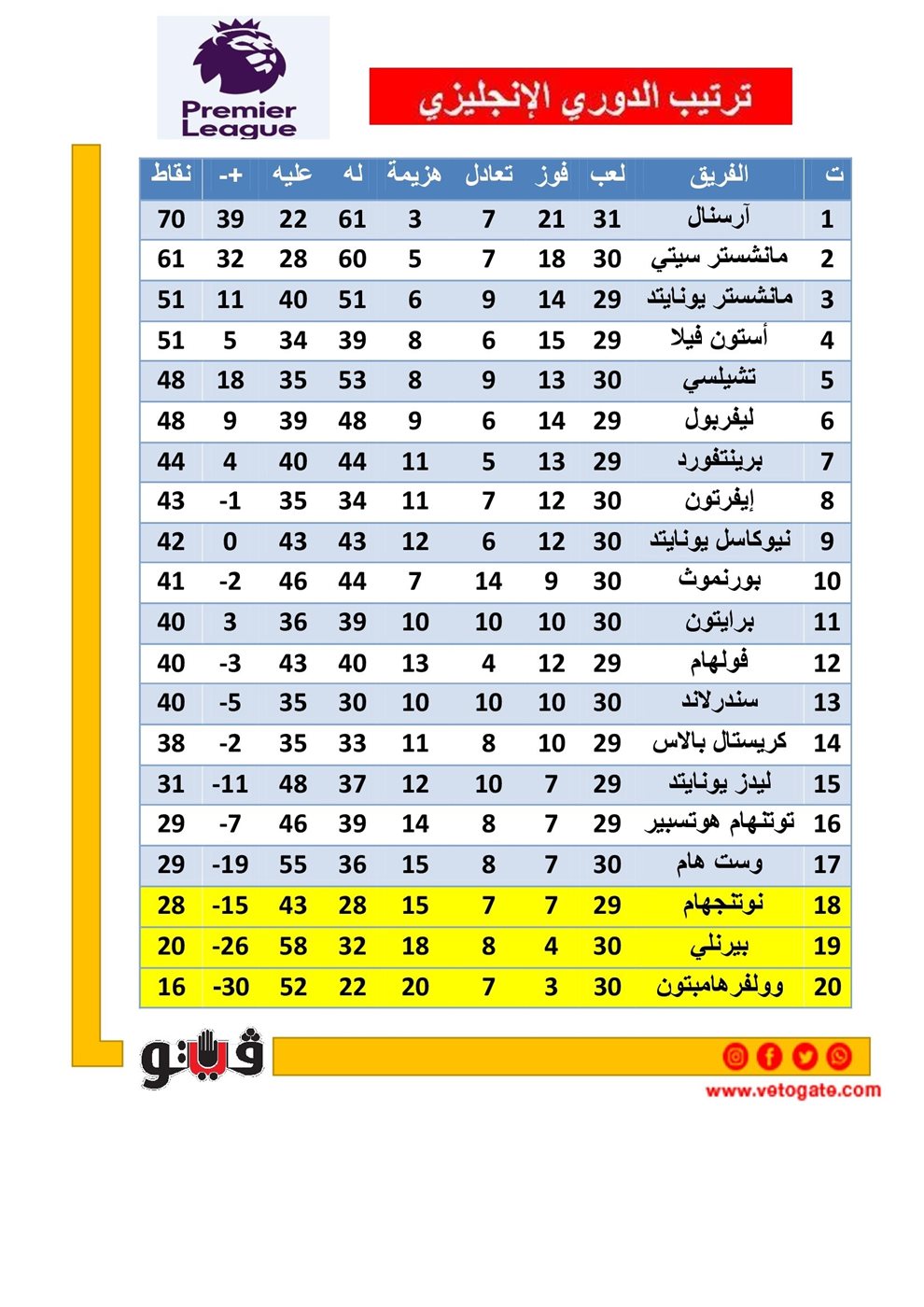 1. أرسنال، 70 نقطة.