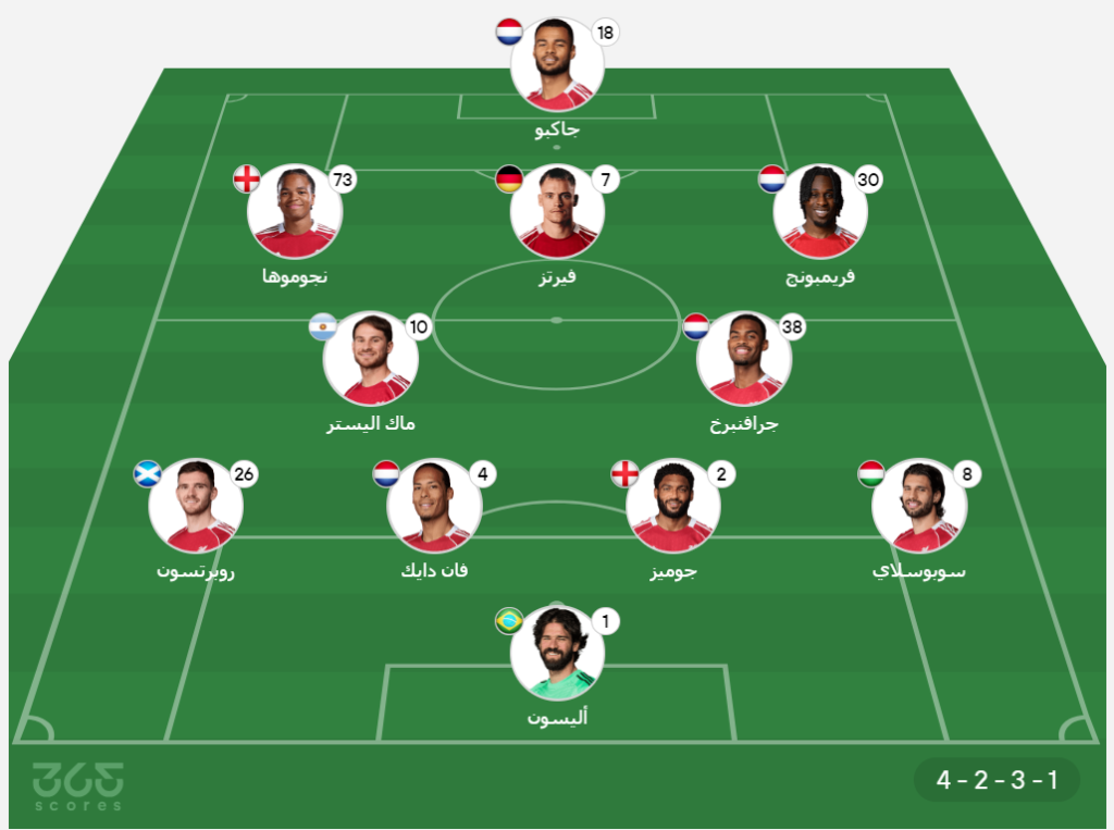 • خط الدفاع: أندرو روبرتسون، فيرجيل فان دايك، جو جوميز، دومينيك سوبوسلاي