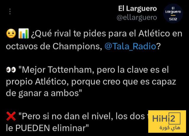في إطار التحليلات الرياضية المتعلقة بمستوى الأندية في دوري أبطال أوروبا، أشار الصحفي تالافيرا خلال حديثه عبر إذاعة كادينا سير إلى أهمية الأداء الفردي والجماعي لفريق أتلتيكو مدريد في مواجهاته المقبلة، حيث أعرب عن تفضيله مواجهة فريق توتنهام في ثمن النهائي، مشددًا على أن نجاح الأتليتي يعتمد بشكل كبير على مستواه الخاص، مما يعكس أهمية التحضير الجيد والاستعداد الجاد لكل مباراة.
