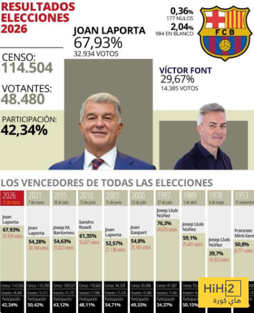 أفادت صحيفة موندو ديبورتيفو بأن خوان لابورتا قد أصبح ثاني رئيس يحصل على أكبر عدد من الأصوات في تاريخ نادي برشلونة بعد انتخابه في عام 2026 مما يعكس التأييد الكبير الذي يحظى به في أوساط المشجعين.