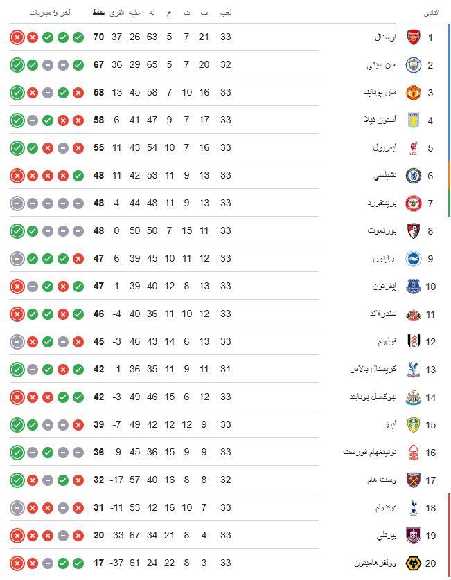 وبهذا الفوز، رفع مانشستر سيتي رصيده إلى 67 نقطة ليحتل المركز الثاني بفارق 3 نقاط عن آرسنال المتصدر، مع العلم أن السيتي لديه مباراة مؤجلة مما يفتح المجال أمامه لتقليص الفارق.
