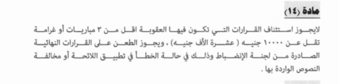 تنص المادة رقم 14 من اللائحة الجديدة المعتمدة بتاريخ 17-2-2026 على أنه لا يجوز استئناف القرارات التي تكون فيها العقوبة أقل من 3 مباريات أو غرامة تقل عن 10 آلاف جنيه، ويجوز الطعن على القرارات النهائية الصادرة من لجنة الانضباط في حالة وجود خطأ في تطبيق اللائحة أو مخالفة النصوص الواردة بها.
